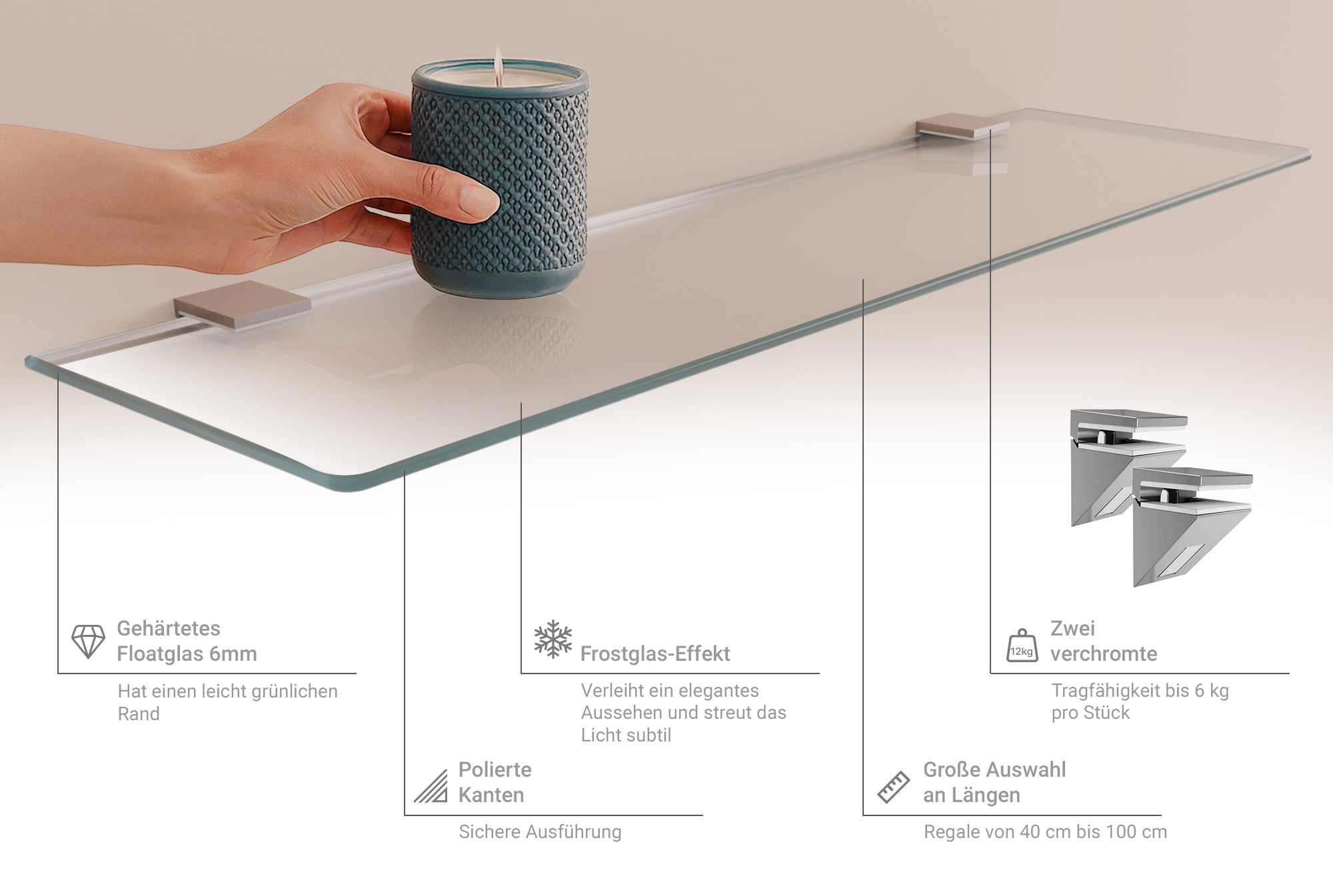 - Materialqualität: Hergestellt aus gehärtetem Floatglas mit mattierter Folienoberfläche, bietet das Regal erhöhte Schlagfestigkeit und Langlebigkeit, die für den Feuchtraum geeignet ist.