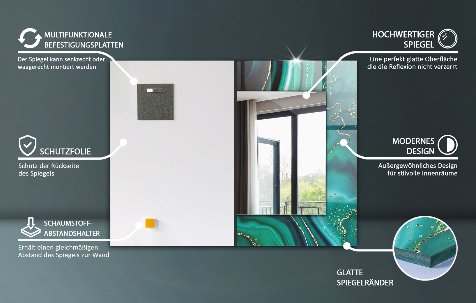 Verwandeln Sie Ihre Wohnung mit unseren stilvollen rechteckigen dekorativen Spiegeln! Unsere Spiegel sind von einem auffälligen Aufdruck umgeben und bilden dadurch schöne Elemente, die die Ästhetik von modernen und eleganten Innenräumen unterstreichen werden. Egal, ob Sie Ihren Flur erhellen oder Ihrem Schlafzimmer einen Hauch von Luxus verleihen möchten, diese Spiegel sind der perfekte Weg, um einen "Wow"-Effekt zu erzielen! Dank der Langlebigkeit der Stoffe, aus denen die Spiegel hergestellt wurden, werden Sie viele Jahre lang Freude an ihnen haben. Wir bieten bedruckte Dekorationsspiegel in den Größen 60x60 cm und 60x80 cm an, deren Rahmen aus gehärtetem Glas gemacht sind. Die rechteckigen Spiegel lassen sich mit den im Set enthaltenen Metallbügeln und Schaumstoffabstandshaltern leicht an der Wand aufhängen.